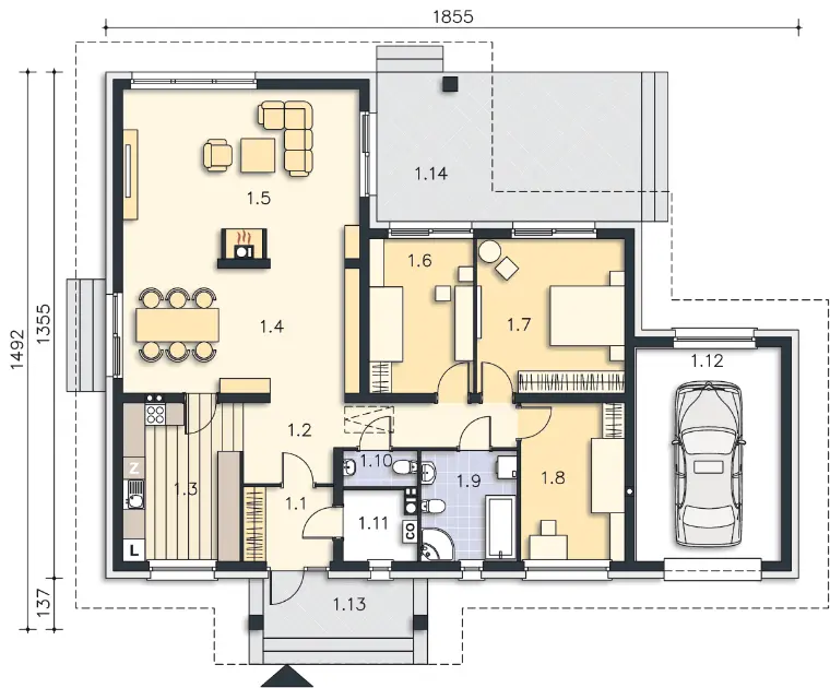 Priestranný jednoposchodový dom s tromi spálňami. Upúta pozornosť viac šikmou strechou a zaujímavými fasádnymi detailmi. Fantasticky naplánovaný obytný priestor sústredený okolo domu: svetlá obývacia izba so zvýšeným stropom, otvorená do jedálne, kde sa zmestí stôl pre celú rodinu a pohodlná kuchyňa. Súčasťou domu je aj garáž pre jedno auto. Je možné využiť aj podkrovný priestor.