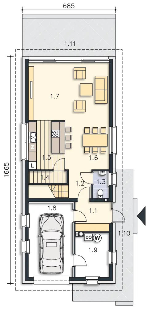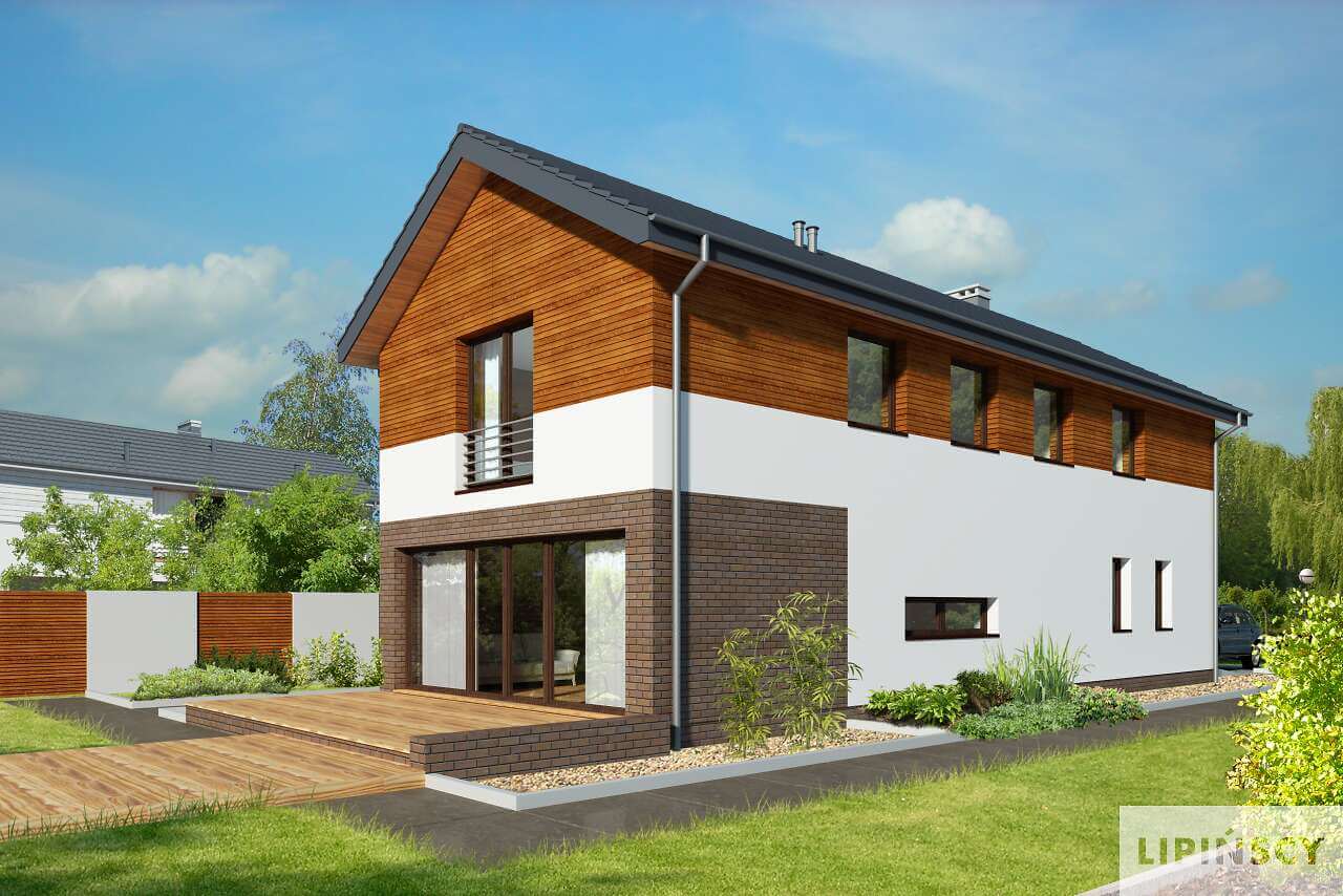 Projekt domu na úzky pozemok, ideálny pre päťčlennú rodinu. Obývacia izba s presklenou južnou stenou umožňuje spojenie s prírodou otvorením do záhrady. Vedľa otvorenej kuchyne, ktorá má praktickú špajzu, je miesto na rodinný stôl. K dispozícii je aj WC a priestor garáže s veľkou kotolňou. Na poschodí sa nachádza spálňa rodičov s možnosťou usporiadania šatníka, tri detské izby a priestor na priestrannú vstavanú skriňu.