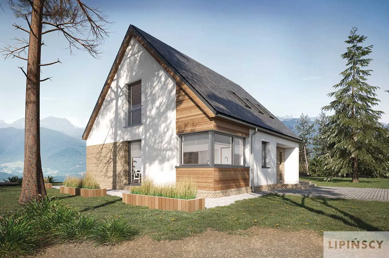 Návrh kompaktného domu so sedlovou strechou a podkrovím na medziposchodí. Hneď pri vstupe je praktický šatník a na opačnej strane je prechod cez technickú miestnosť do kuchyne. Miestnosť s tepelným čerpadlom a rekuperátorom môže slúžiť aj ako šikovná špajza. Obývacia časť je otvorená, spája kuchyňu, jedáleň a obývačku a má schodisko na druhé poschodie. Otvorením stropu nad obývacou izbou sa priestor ešte zväčší. Na poschodí sú dve spálne, kúpeľňa a práčovňa.